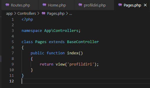 Untuk menangani pemanggilan view profildiri, saya memanfaatkan function bawaan yaitu index. Karena memang halaman/view profildiri ini nantinya akan dijadikan halaman utama atau root.